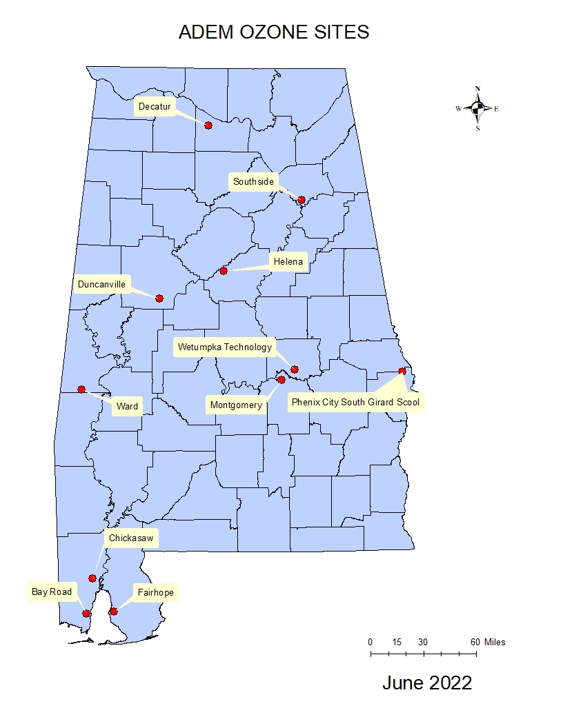 Locations of ADEM PM2.5 and ozone monitors in Alabama.
